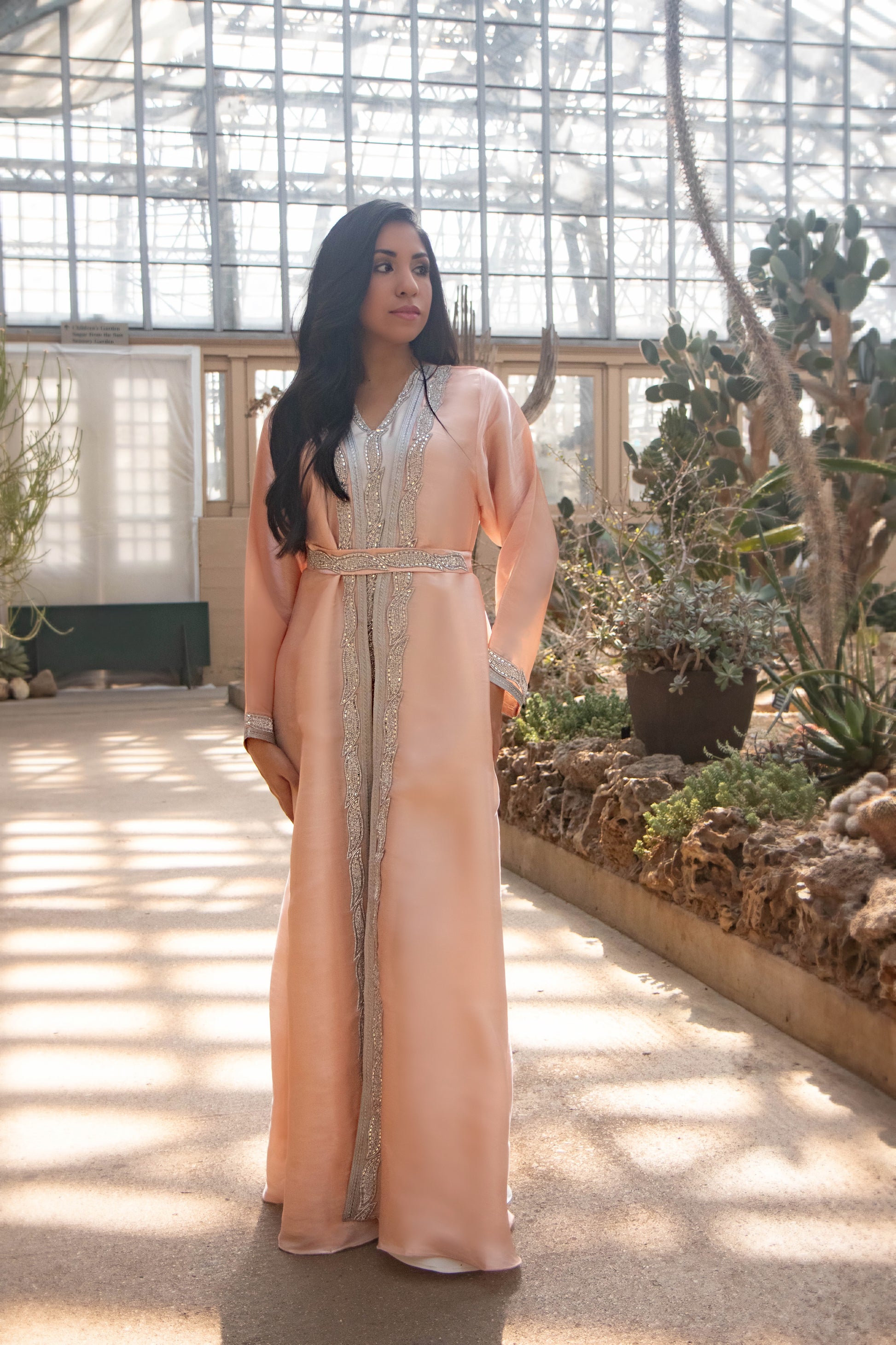 The ensemble includes a luxurious Organza Peach robe that flows beautifully, measuring 143 cm/56 in at the back, perfectly complemented by a stylish matching belt with rhinestone accents. Crafted from super soft, lightweight, and breathable materials, this kaftan ensures all-day comfort, making it a perfect choice for various occasions.