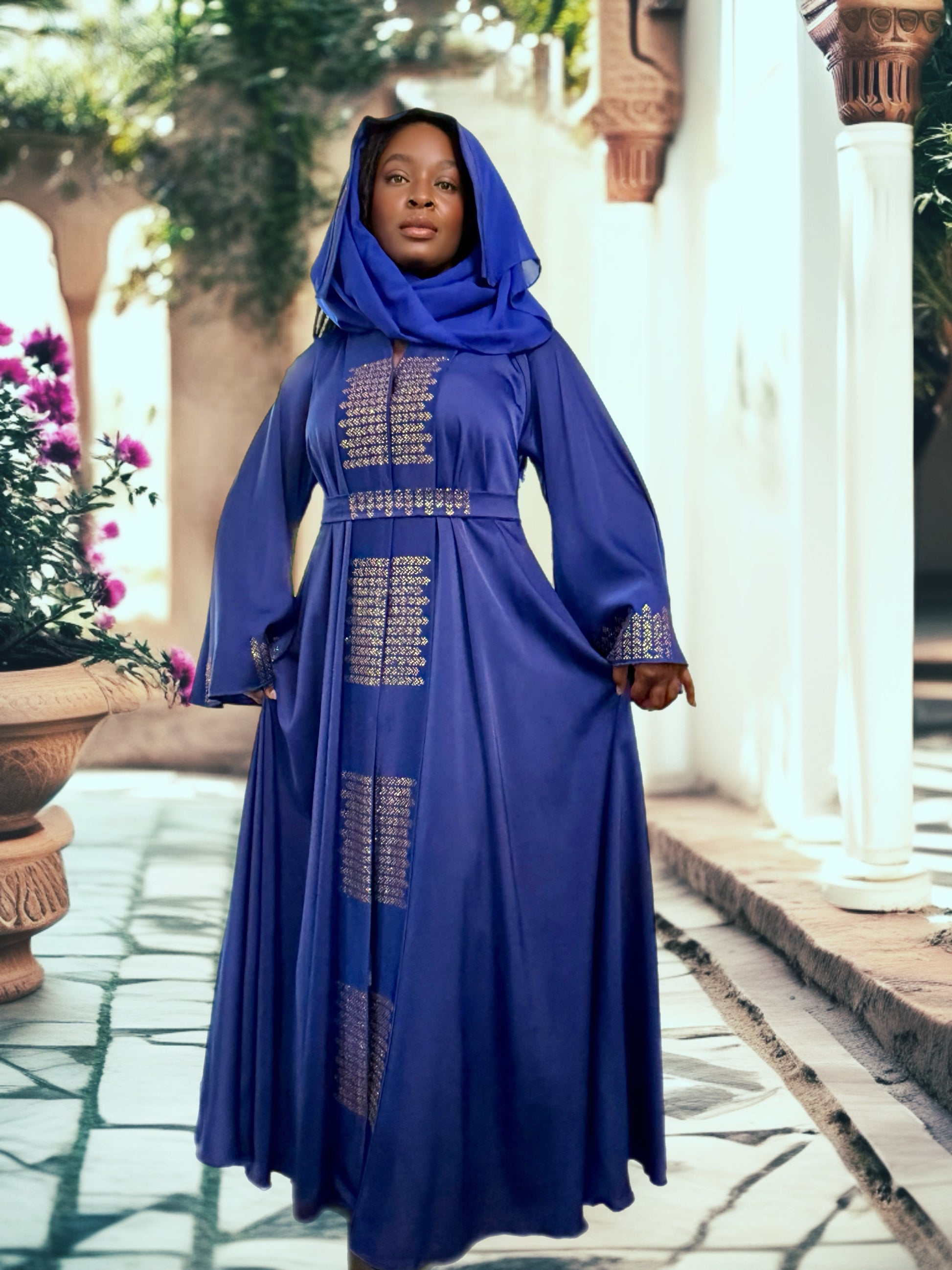 The Widad Abaya is designed with Royal Blue Russian Satin is vibrant and deep, often associated with richness and elegance, with an intricate gold rhinestone pattern down the front and bottom of sleeves that adds a luxurious touch. The flowing design includes long sleeves and a adorned belt, adding the option of a cinched waist, to enhancing the silhouette, and a royal blue chiffon head scarf. She measures 148 cm (58 inches) from the back. The Warda Abaya is a striking choice for traditional wear and special occasions.
